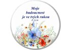 Magnet o průměru 50 mm s biblickým veršem.