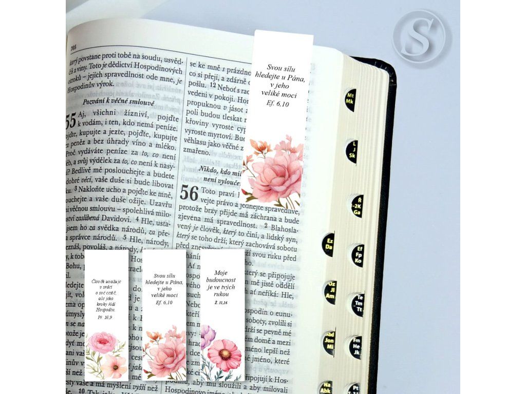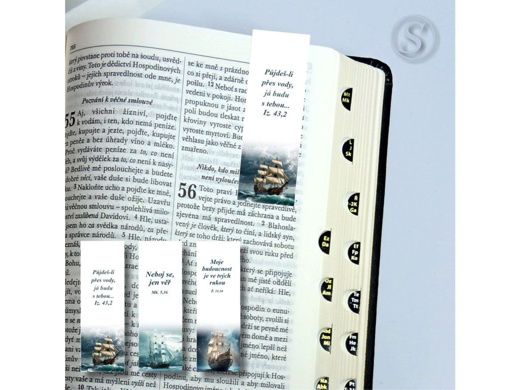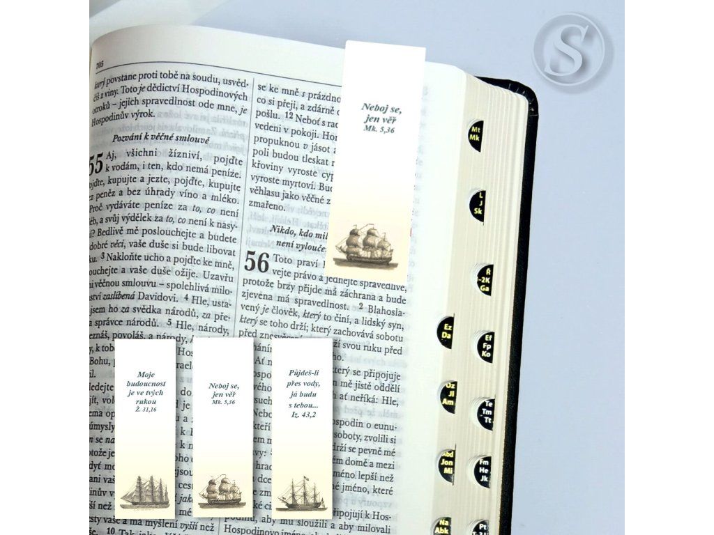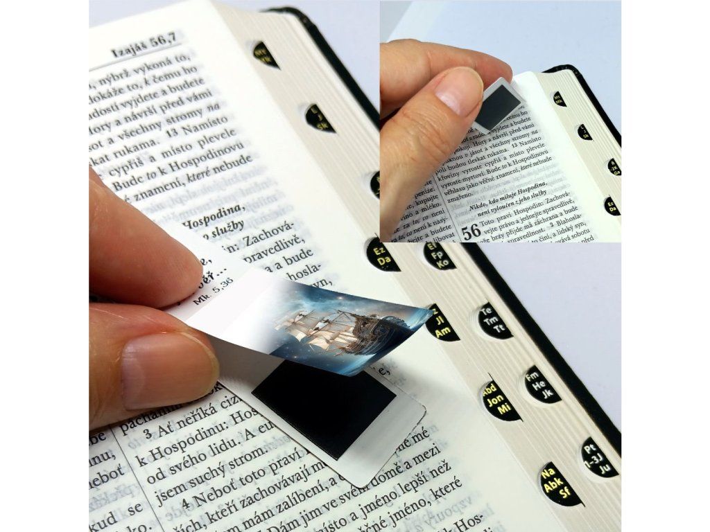 Sada tří minizáložek s biblickým motivem o rozměru 20 x 120 mm – záložky jsou v polovině přeložené a opatřené tenkým magnetem, takže v knize bezpečně drží. Záložky jsou vždy v sadě po třech kusech zabaleny v dárkovém balení v celofánovém sáčku.